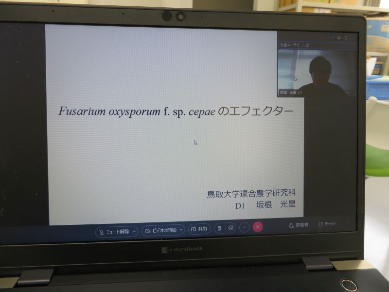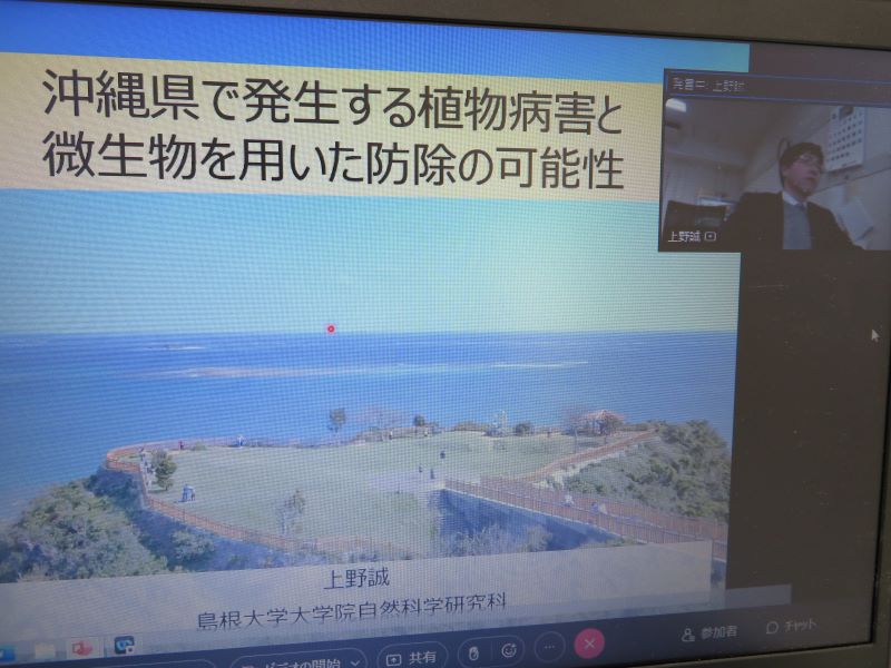 冒頭に伊藤部門長から開会挨拶があった後、鳥取大学連合農学研究科博士課程1年のSiddiqa Ayeshaさん(山口大配属、阿座上研究室)による「虫歯菌のバイオフィルム制御」、同じく鳥取大学連合農学研究科博士課程1年の坂根光星さん(山口大配属、伊藤研究室)による「Fusarium oxysporum f. sp. cepaeのエフェクター」の2題の一般講演があった。休憩をはさんで、島根大学大学院自然科学研究科の上野誠教授による「沖縄県で発生する植物病害と微生物を用いた防除の可能性」と題した特別講演があった。いずれの講演も、未発表の新知見を含んだもので、基礎研究の発展に資するだけでなく、社会実装につながる内容であったことから、講演後に多くの質問が寄せられた。