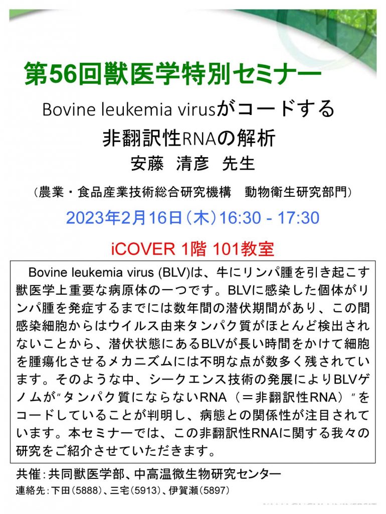 2023年2月16日に当センターと共同獣医学部の共催で第56回獣医学特別セミナーが開催され,参加人数は23名でした。Bovine leukemia virusの病態解明につながるかもしれない非翻訳性RNAの解析について分かりやすくご講演いただき、活発な議論をいただきました。
