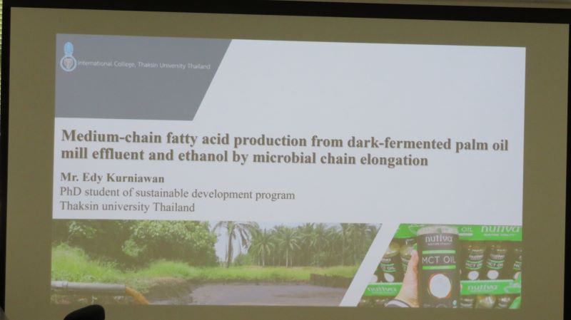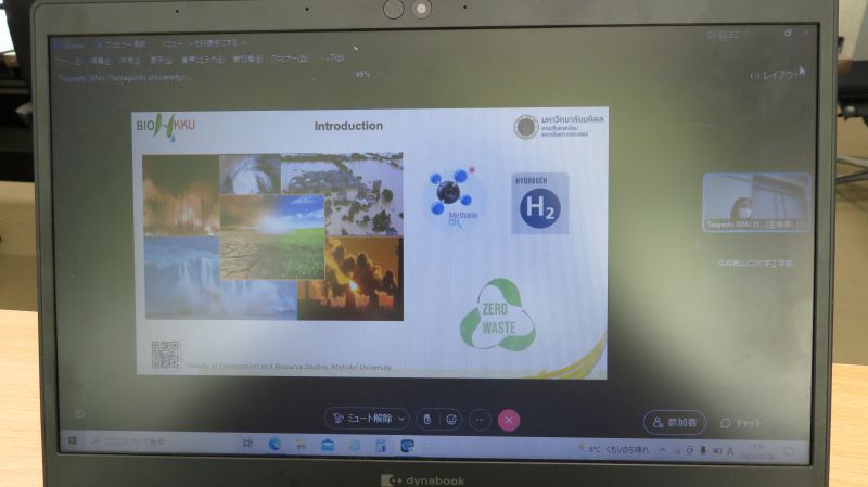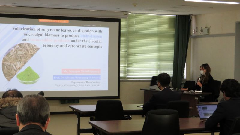 タクシン大学のEdy Kurniawanさんから「Medium-chain fatty acid production from dark-fermented palm oil mill effluent and ethanol by microbial chain elongation」と題して、コンケン大学のNapapat Sitthikitpanyaさんから「Valorization of sugarcane leaves co-digestion with microalgal biomass for the production of biofuels and value-added products under the circular economy and zero waste concepts」と題して、マヒドン大学のSureewan Sittijunda先生から「Biohythane biochemical and fertilizer pellet production from a co-digestion of vinasse and spent brewer yeast cells」と題して一般講演をいただいた。
