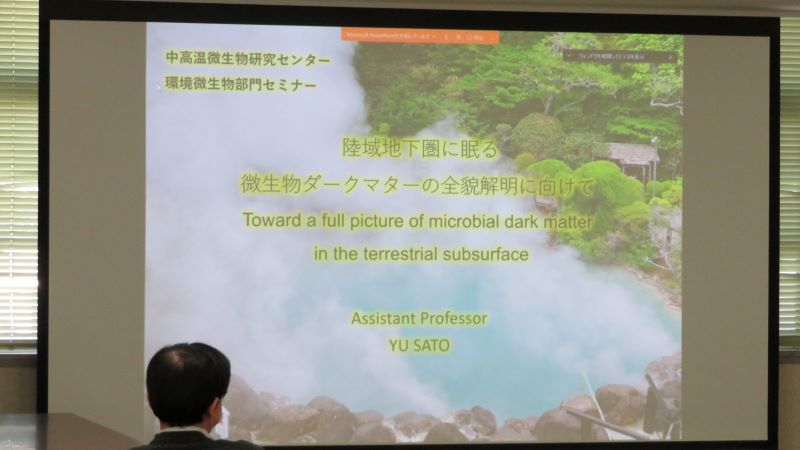 続いて、山口大学中高温微生物研究センターの佐藤悠先生から「陸域地下圏に眠る微生物ダークマターの全貌解明に向けて(Toward a full picture of microbial dark matter in the terrestrial subsurface)」と題して特別講演をいただいた。