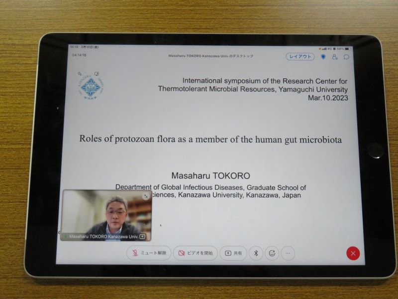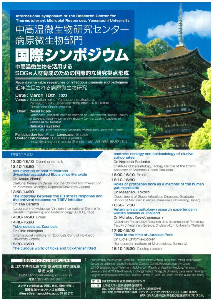 2023年3月10日(金)に山口県教育会館ホールにて,International symposium of the Research Center for Thermotolerant Microbial Resources, Yamaguchi University中高温微生物研究センター 病原微生物部門 国際シンポジウム~中高温微生物を活用するSDGs人材育成のための国際的な研究拠点形成~を開催しました。対面とオンラインによる開催で,学内外から61名の参加者がありました。