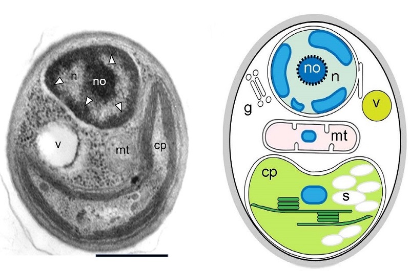メダカモは非常に単純な細胞内構造を示す。細胞内小器官として、核(n)、核小体(no)、液胞(v)、ミトコンドリア(mt)、葉緑体(cp)、ゴルジ体(g)を1個ずつ持つ。また、葉緑体内にはデンプン(s)を貯蔵する。スケールバーは500 nmを示す。