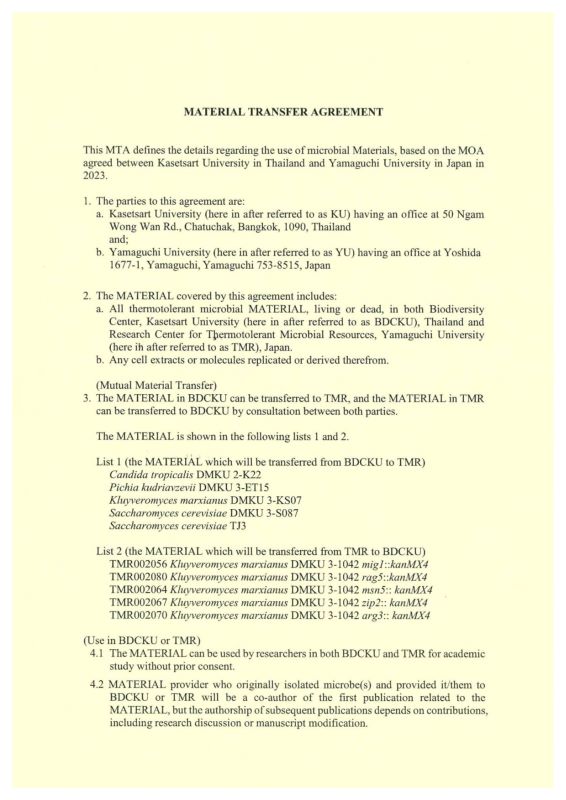 これまでも両センター間では耐熱性微生物の共同利用に関する協議を進めてきており、令和5年2月に谷澤学長と山田センター長補佐がカセサート大学を訪問した際には、耐熱性微生物のデータベース構築と共同研究に関する協定書の調印を行っていました。