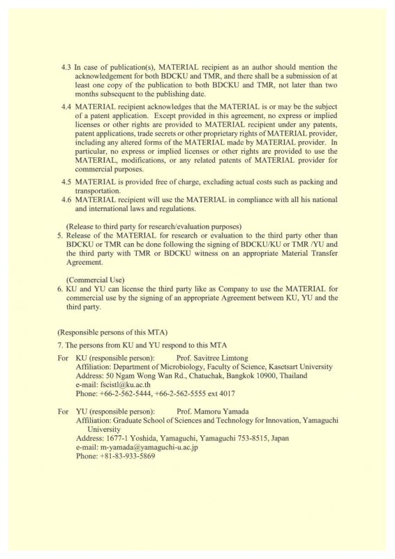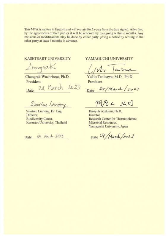 この際に、中高温微生物研究センターとカセサート大学のバイオダイバーシティセンターとの間で、両センター間の微生物サンプルの移動に関する同意書にも、山口大学谷澤学長、カセサート大学Wachrinrat学長および阿座上センター長がサインしました。