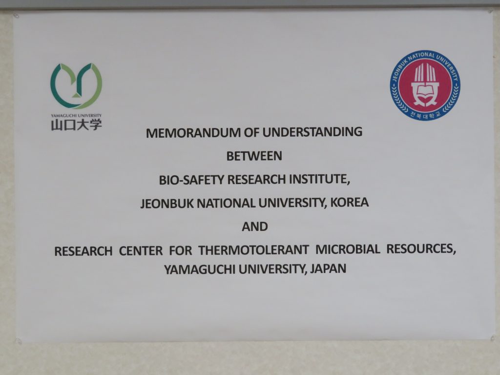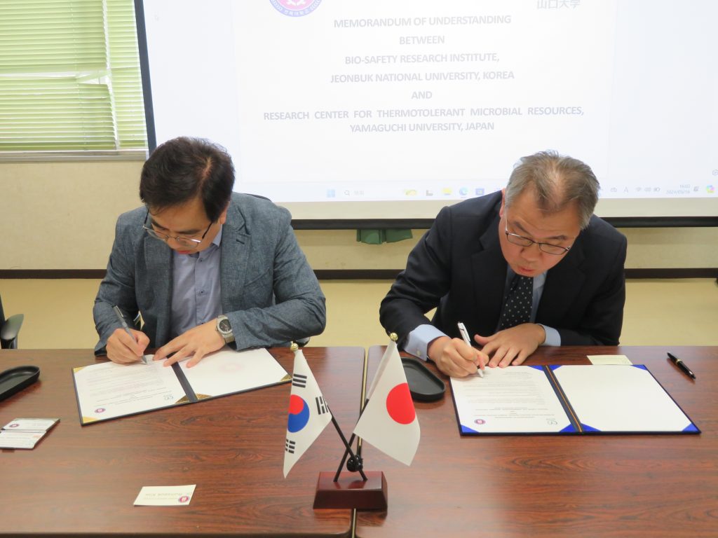 2024年5月,中高温微生物研究センターは、韓国の全北大学(JEONBUK NATIONAL UNIVERSITY)のバイオセーフティ研究所(BIO-SAFETY RESEARCH INSTITUTE)と連携協定(MOU)を締結しました。この協定により、両機関が相互の強みを生かして、研究者や学生の派遣・招聘やセミナーやシンポジウムの開催、共同研究の実施などの研究交流を推進します。