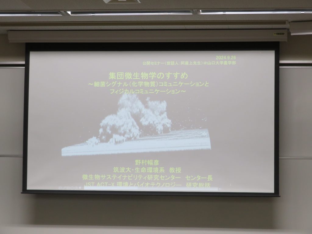 2024年9月26日(木)16時30分より、山口大学農学部・共同獣医学部大講義室において,筑波大学微生物サステイナビリティ研究センターのセンター長の野村暢彦先生の特別セミナーを開催しました。微生物サステイナビリティ研究センターと本センターは2022年8月に包括連携協定を締結しており,その後も共同研究やセミナー・シンポジウムなどの相互交流を続けています。野村先生には,本学大学院創成科学研究科の集中講義(生物機能科学特別講義II)の講師として来学されたのを機に,今回の特別セミナーをお願いいたしました。