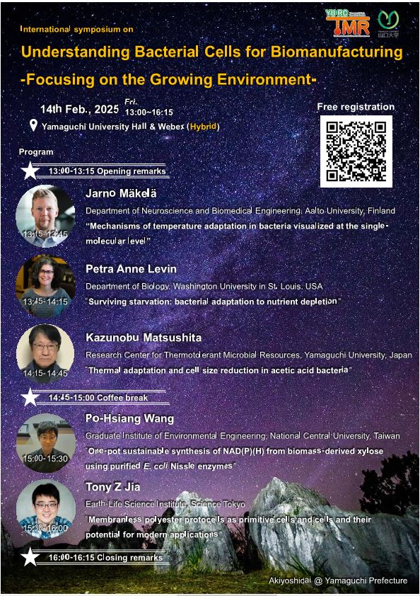 2025年2月14日(金)、山口大学大学会館2階会議室(吉田キャンパス)において、中高温微生物研究センター発酵部門及び環境微生物部門による国際シンポジウムを開催しました。 本国際シンポジウムは、高坂智之准教授(農学部、中高温微生物研究センター発酵微生物部門副部門長)と佐藤悠助教(農学部、中高温微生物研究センター)が共同責任者となり、“Understanding Bacterial Cells for Biomanufacturing -Focusing on the Growing Environment-“と題し、日本、フィンランド、アメリカ、台湾からの5名の国際的な招待講演者により最新の微生物研究に関連する知見が発表されました。対面とオンラインによるハイブリッドで開催されたシンポジウムには、学内外から62名(うち現地参加37名、オンライン25名)の参加者があり、活発な研究議論が繰り広げられました。