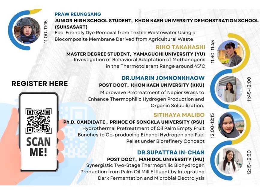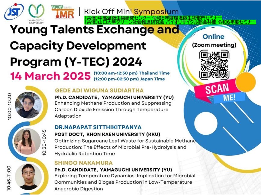 3月14日12:00-14:30に中高温微生物研究センター環境微生物部門セミナーがオンラインにて開催された。このセミナーはJSTのNEXUS若手人材交流プログラム(研究代表者:今井剛)、山口大学グリーン社会推進研究会 バイオリサイクル部会共催 令和6年度セミナーとの併催で行われ、日本(山口大学)とタイ(コンケン大学、プリンス・オブ・ソンクラー大学パッタニー校、マヒドン大学)の双方から発表が行われた。発表は8件で、主に熱帯系のバイオマスから嫌気性発酵を用いたバイオガス(バイオ水素、バイオメタン)生産に関するもので、嫌気性発酵の材料となる熱帯性バイオマスの前処理に関するものもあった。日本でも植物系バイオマスをエネルギーに転換できる可能性を持ったものである。山口大学からは博士後期課程の学生2名、博士前期課程の学生1名、コンケン大学からはポスドク2名、高校生1名(JSTのNEXUS若手人材交流プログラムで招へい予定)、プリンス・オブ・ソンクラー大学パッタニー校とマヒドン大学大学からはそれぞれ1名であった。参加者は総数47名(日本人11名、外国人36人)で、発表後の質疑応答では活発な議論が行われた。
