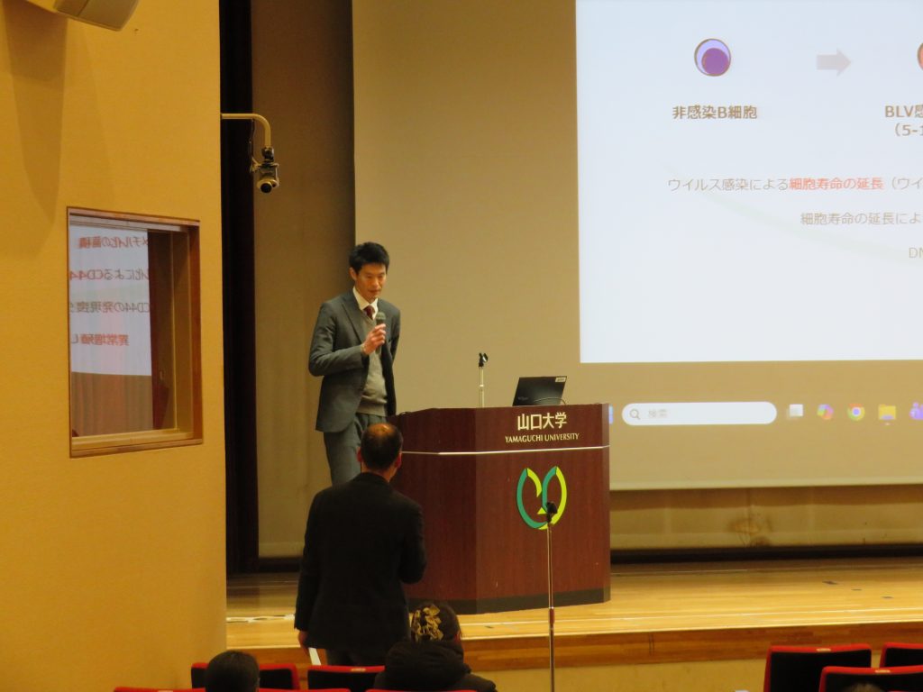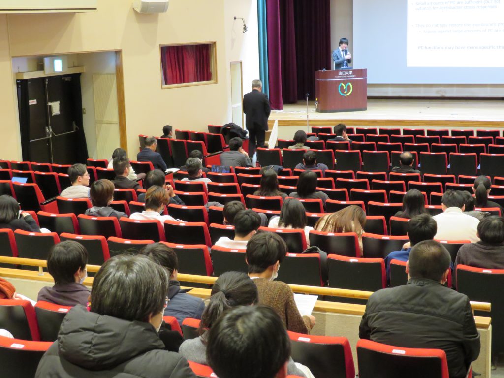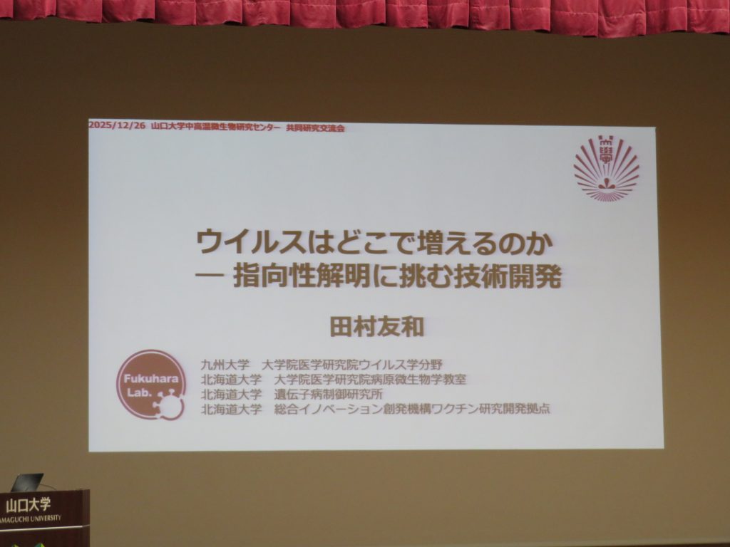 令和7年12月26日(金)山口大学大学会館において中高温微生物研究センター公募型共同研究交流会を開催いたしました。第1部では、星田センター長のあいさつに続き、令和6年度に採択された18件の共同研究から7名の共同研究者の方々に来学いただき、研究内容をご発表いただきました。また、センターの4部門から各1名ずつ研究発表がありました。学内から約160名の参加がありました。