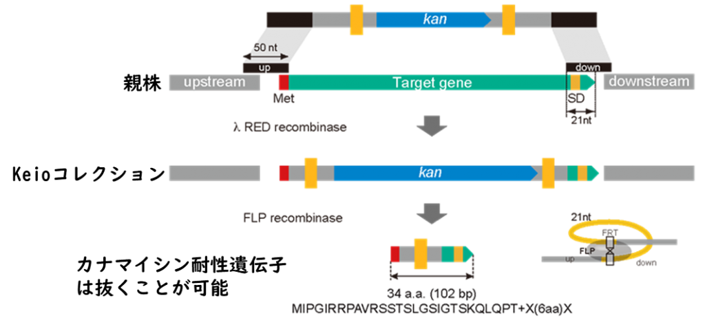 ・大腸菌予測遺伝子の欠失株として、相同組換えによりカナマイシン耐性遺伝子断片を対象の遺伝子と置換することで作製したもの(PubMed:16738554)